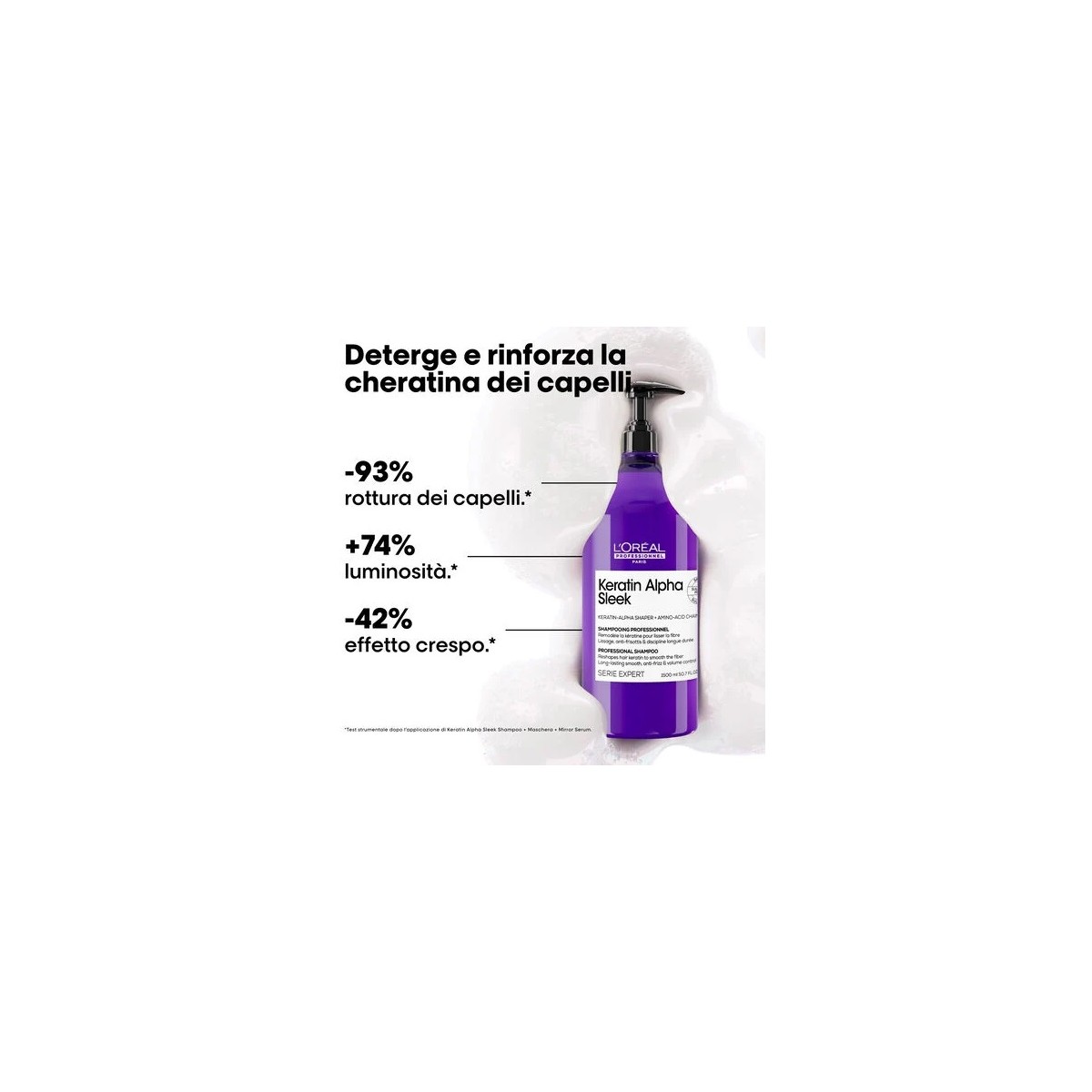 Utilizzato con la routine completa Keratin Alpha Sleek, garantisce fino a 2 settimane di controllo anticrespo e anti-volume (test strumentali).